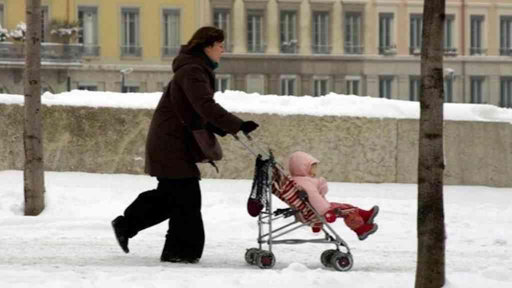 Mulher caminha com carrinho de bebê por rua tomada pela neve em Lyon, na França