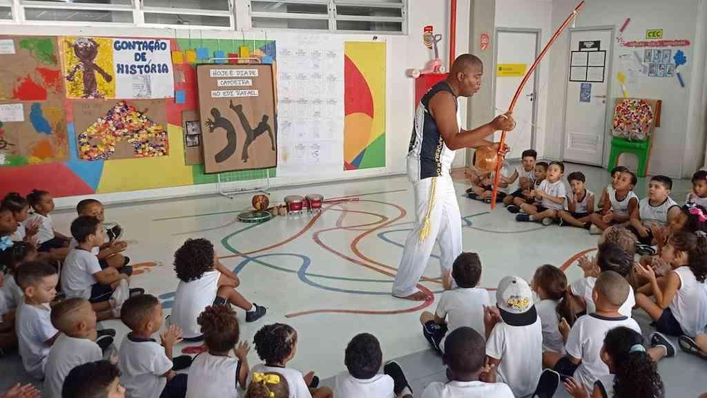 No Espaço de Desenvolvimento Infantil (EDI) Madalhista Olímpico Rafael Carlos da Silva, que atende a 430 crianças com idades entre 1 e 6 anos, em Santíssimo, na Zona Oeste do Rio, além da palestra sobre racismo, Sobreira deu uma aula prática sobre a capoeira e musicalidade. Entre os alunos participantes havia crianças com deficiência.