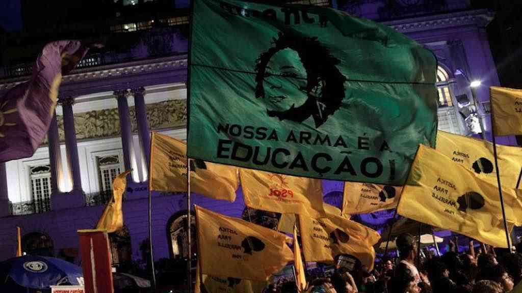 Bandeira com a imagem da vereadora assassinada Marielle Franco, durante manifestação para o aniversário do crime no Rio de Janeiro