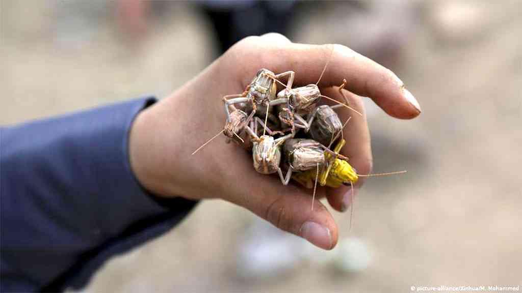 Há meses, milhões de gafanhotos do deserto se abatem sobre parte da África, Ásia e Oriente Médio, destruindo áreas cultivadas e pastos. Os insetos permanecem inicialmente no solo, mas alçam voo na fase adulta, podendo cobrir até 130 quilômetros por dia, em condições de vento favoráveis. Uma vez assentado, um enxame de um quilômetro quadrado de extensão pode consumir diariamente tanto quanto 35 mil seres humanos. Algumas culturas, no entanto, consomem a proteína contida nos insetos, principalmente, nas rações animais.