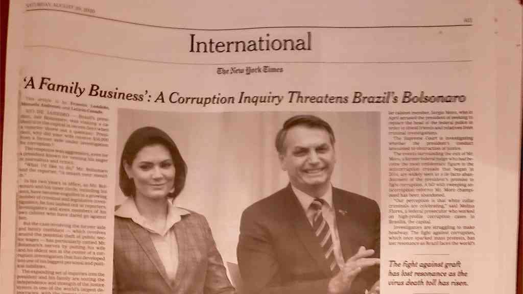 A pergunta que os brasileiros fazem, nos últimos dias, quanto aos depósitos do ex-assessor Fabrício Queiroz na conta da primeira-dama, Michelle Bolsonaro, ecoou no NYT, que publicou página inteira sobre o escândalo da 'rachadinha'.