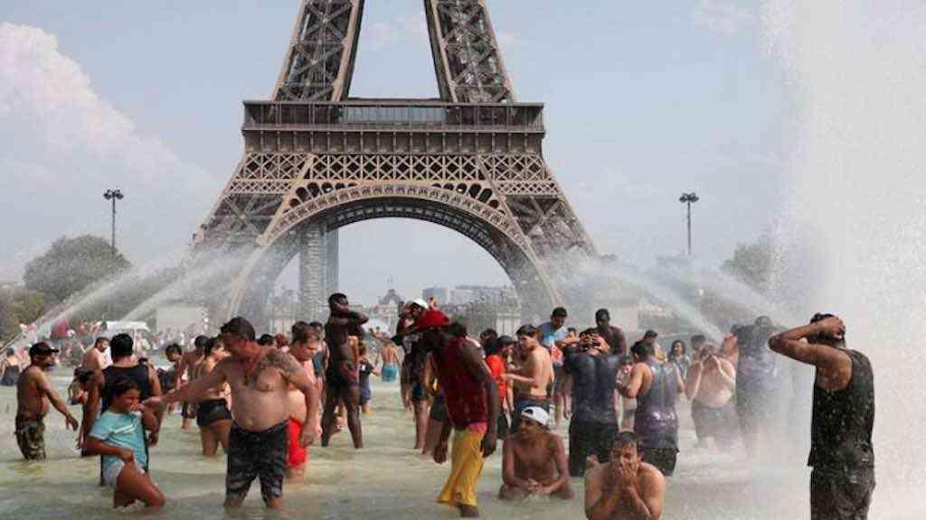Pessoas se refrescam em fontes em frente à Torre Eiffel, em Paris