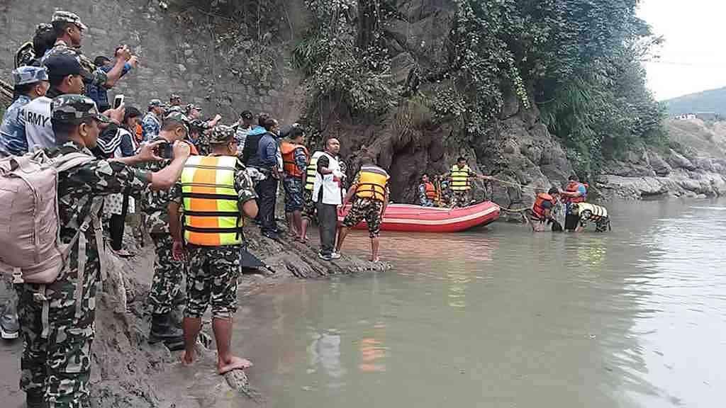 Tanta a polícia nepalesa como membros do Exército prosseguem com os trabalhos de resgate; depois de ter levado mais de seis horas para arrastar o ônibus até a margem do rio.