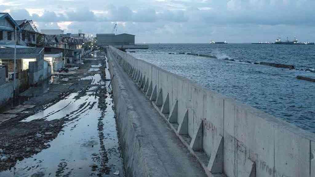 Área residencial em Jakarta, capital da Indonésia, é protegida por muro de contenção