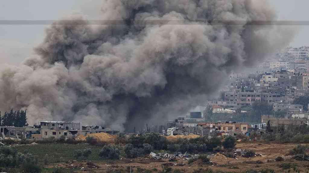 No norte do enclave, a principal área de guerra durante semanas, enormes nuvens de fumaça subiram acima das ruínas, vistas do outro lado da cerca em Israel.