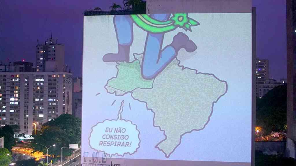 Uma projeção, no Vale do Anhangabaú, Centro de São Paulo na hora do panelaço, representa a indignação e mobilização para o o fim do governo Bolsonaro