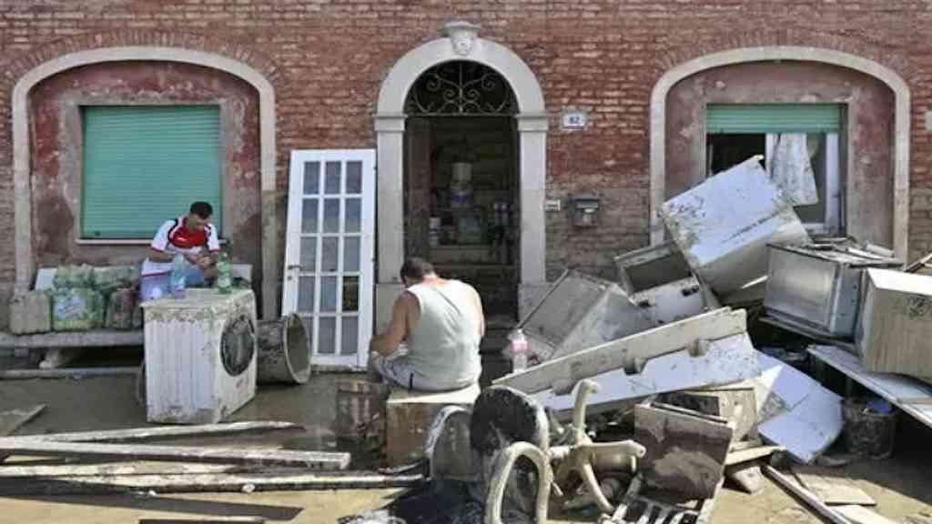 Destruição provocada por inundações em Pianello di Ostra, na região de Marcas