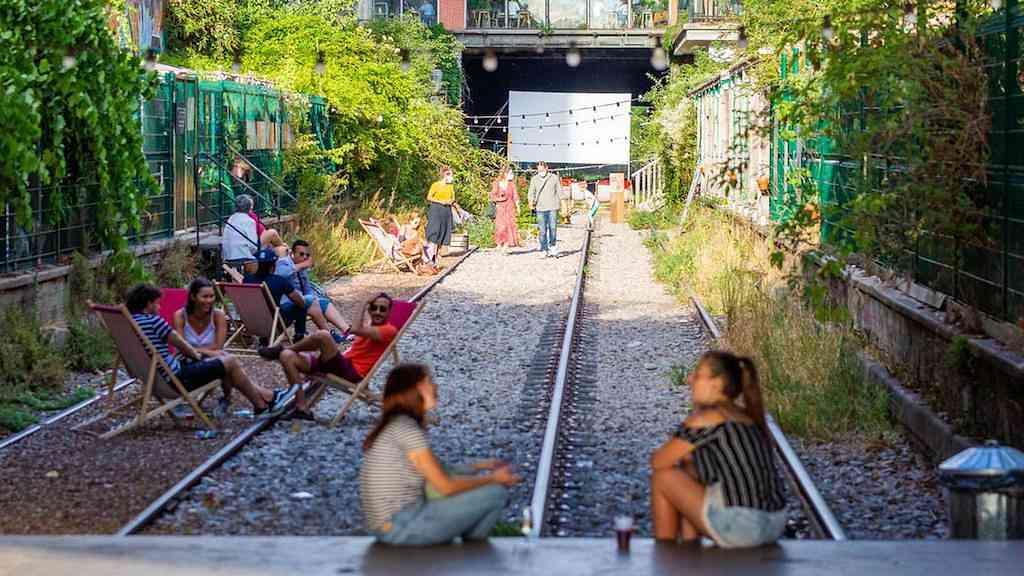A temática da sustentabilidade é incrementada com uma cafeteria, jardins urbanos e até mesmo a venda de alimentos orgânicos e vinho natural. Os antigos trilhos são agora um aconchegante jardim coletivo onde, na fazenda urbana do espaço, há também uma horta e um galinheiro.