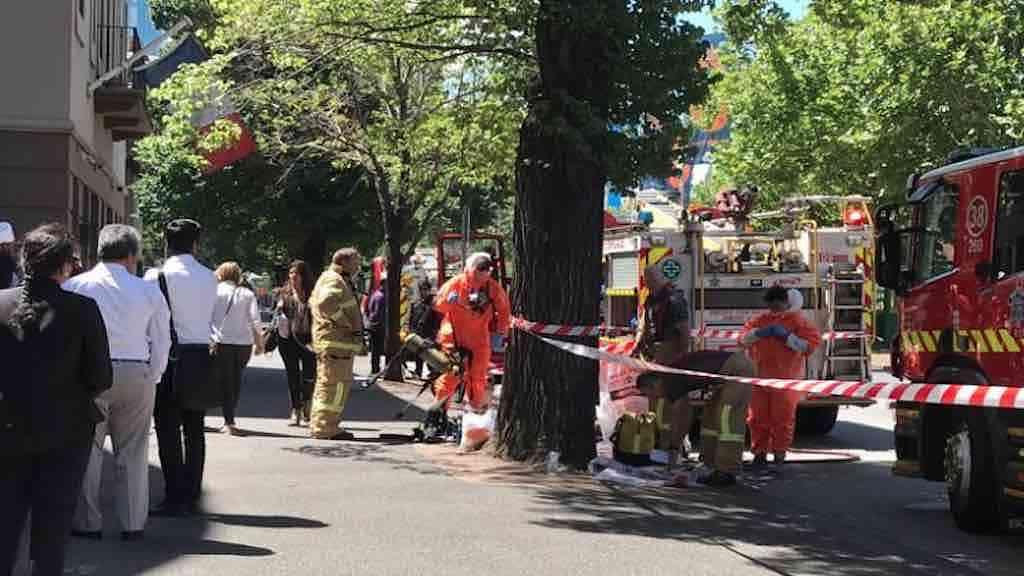 Bombeiros do lado de fora dos consulados da Índia e da França em Melbourne
