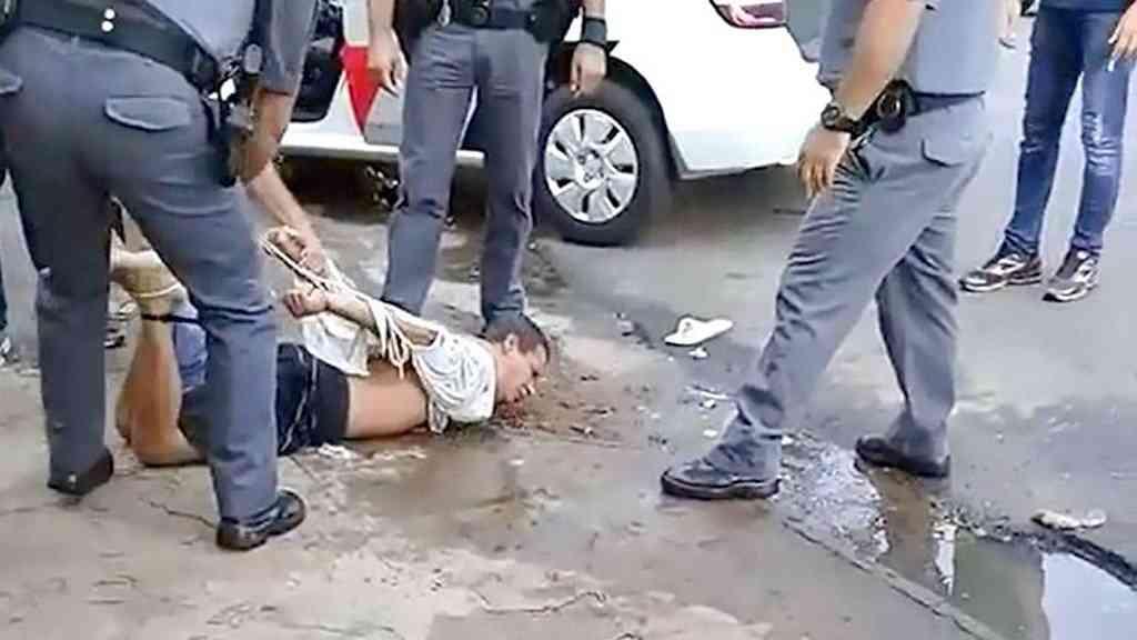 O vídeo da abordagem, que circula em redes sociais, mostra o homem com as mãos amarradas aos pés, de forma que não conseguisse andar, sendo carregado por dois policiais militares (PMs). Os agentes carregam o rapaz segurando-o pela corda e pela camiseta. Ainda amarrado, ele é colocado no porta-malas de uma viatura.