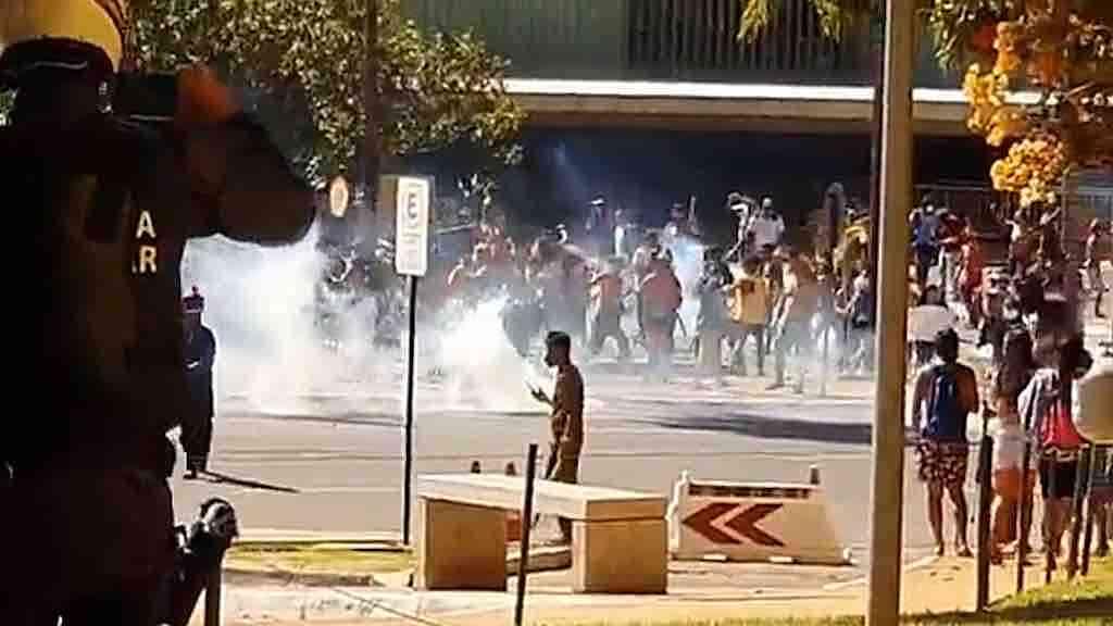 Imagens divulgadas pela Associação dos Povos Indígenas Brasileiros (Apib) mostram manifestantes correndo dos policiais, que disparavam contra a multidão.