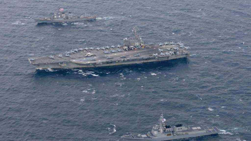 A maior embarcação da Marinha dos Estados Unidos na Ásia, que tem uma tripulação de 5 mil marinheiros; navegou cerca de 160,93 quilômetros e seus caças F-18 Super Hornet realizaram quase 90 voos à vista das ilhas da Coreia do Sul.