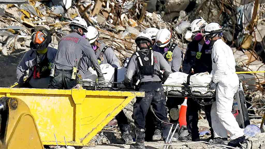 Os preparativos para o trabalho de demolição de um prédio que parcialmente colapsou em Miami estavam em andamento neste domingo, antes da possível chegada da tempestade tropical Elsa e depois de um total já confirmado de 24 mortos no desastre.