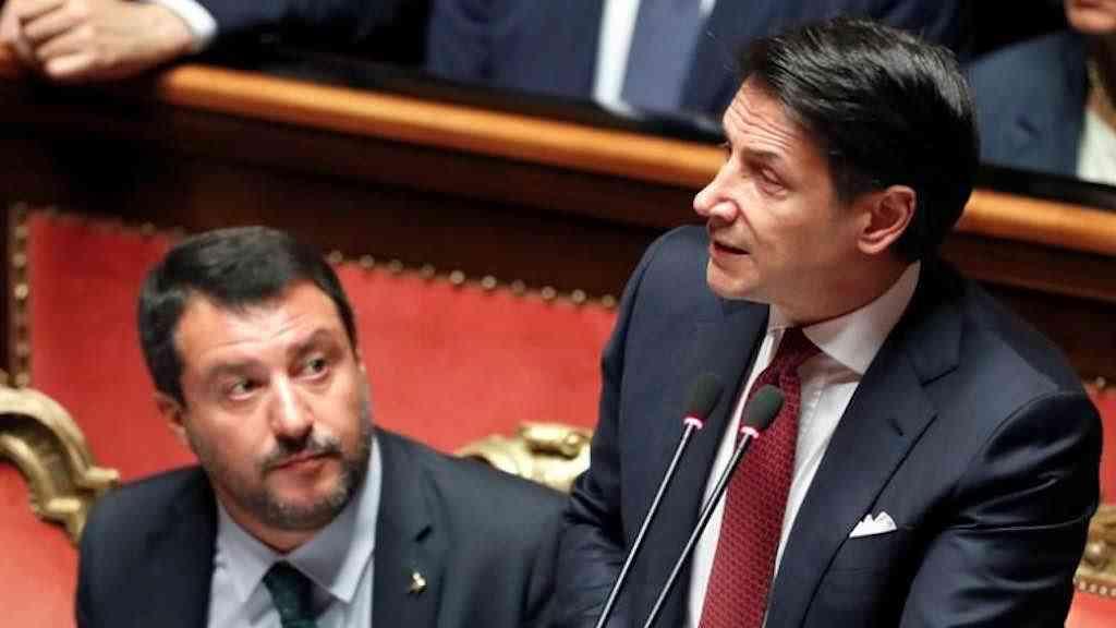 Premiê italiano, Giuseppe Conte, discursa no Senado da Itália ao lado do vice-primeiro-ministro Matteo Salvini