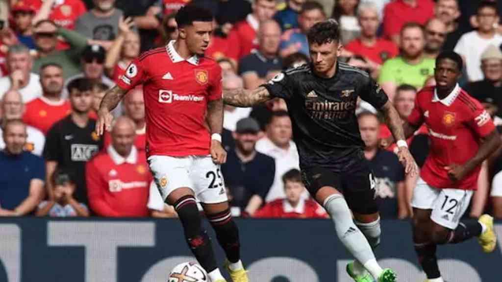 Jadon Sancho e Ben White durante partida entre Manchester e Arsenal