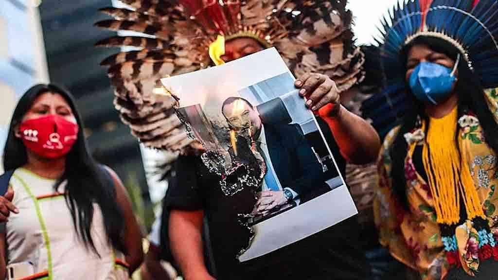 Lideranças queimam foto do presidente da Funai após episódio de repressão à manifestação indígena em Brasília