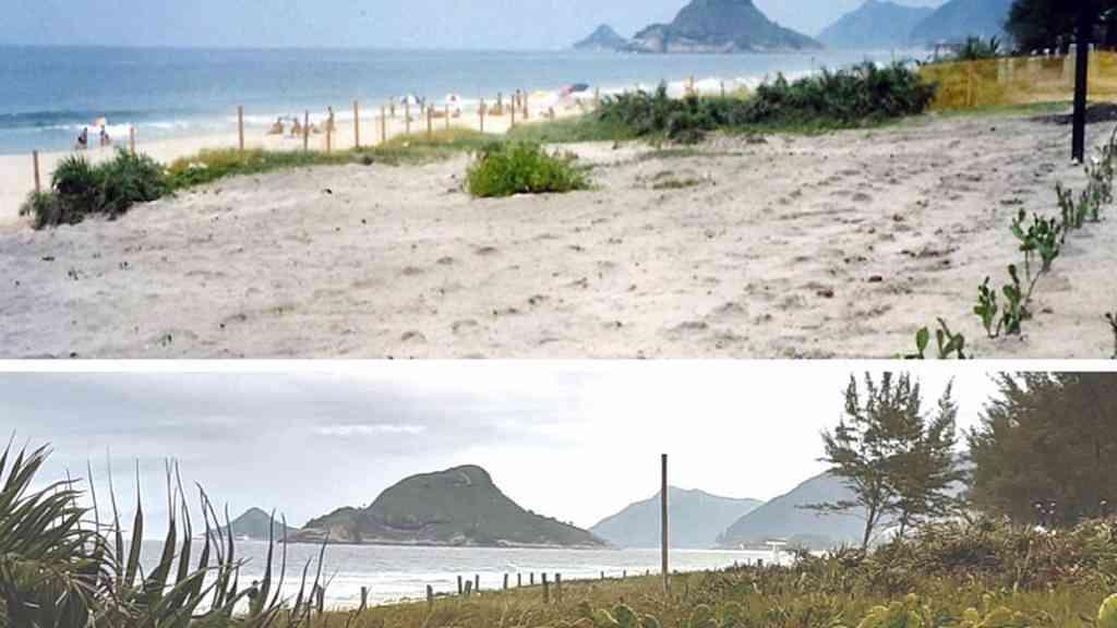A Praia da Reserva em 2002 (alto) e depois do reflorestamento, em 2019