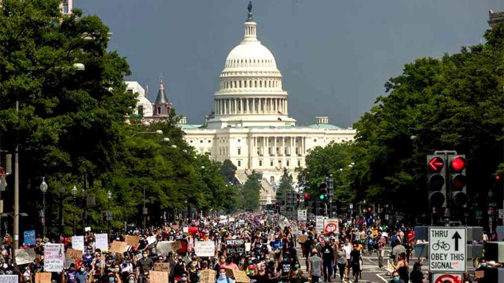 Em Washington, dezenas de milhares de pessoas gritando “Não consigo respirar” e “Mãos para cima, não atire” reuniram-se no Lincoln Memorial e marcharam rumo à Casa Branca, no maior protesto dos 12 dias de manifestações ao redor dos EUA desde a morte de Floyd.