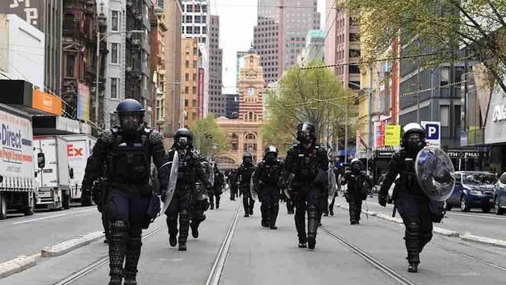 Policiais da tropa de choque nas ruas de Melbourne, na Austrália