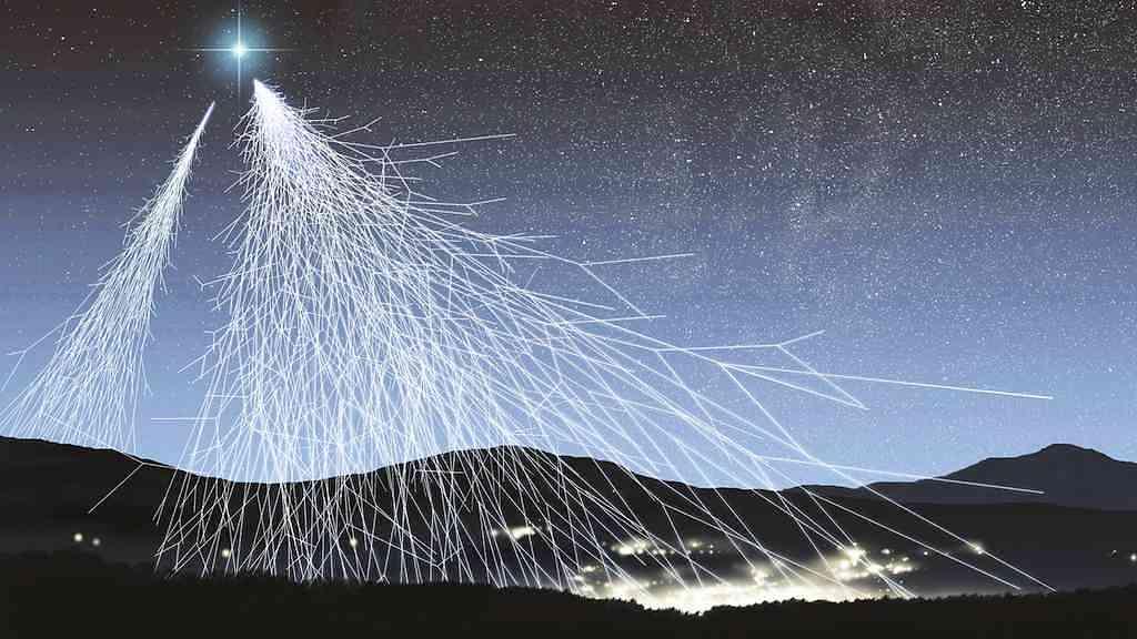 As chuvas de partículas subatômicas de alta energia resultam de colisões que acontecem a 10 km ou mais do solo; quando um raio cósmico de ultra-alta energia encontra átomos da atmosfera, principalmente nitrogênio e oxigênio. Após tais colisões, acontecem reações em cadeia que resultarão num “chuveiro atmosférico” de partículas de alta energia e viajando essencialmente à velocidade da luz.