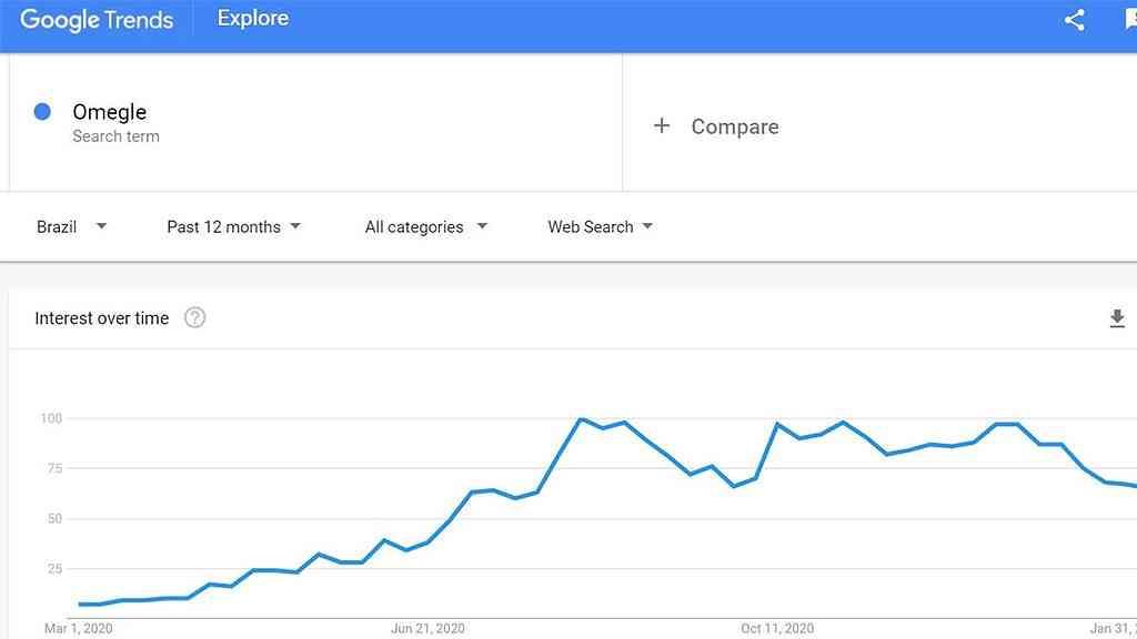 Como você provavelmente sabe, o Omegle lhe dá a oportunidade de escolher o seu idioma para se comunicar enquanto busca por pessoas com quem falar. Isso não permite filtrar os usuários por localização geográfica, mas pelo menos ajuda parcialmente a encontrar pessoas do seu próprio país. Mas como é possível perceber quão ativa é a comunidade em cada país? Para isso, você pode usar o serviço Google Trends, que permite acompanhar a dinâmica da popularidade das consultas de pesquisa. Por exemplo, vamos usar a consulta "Omegle" e ver os resultados.
