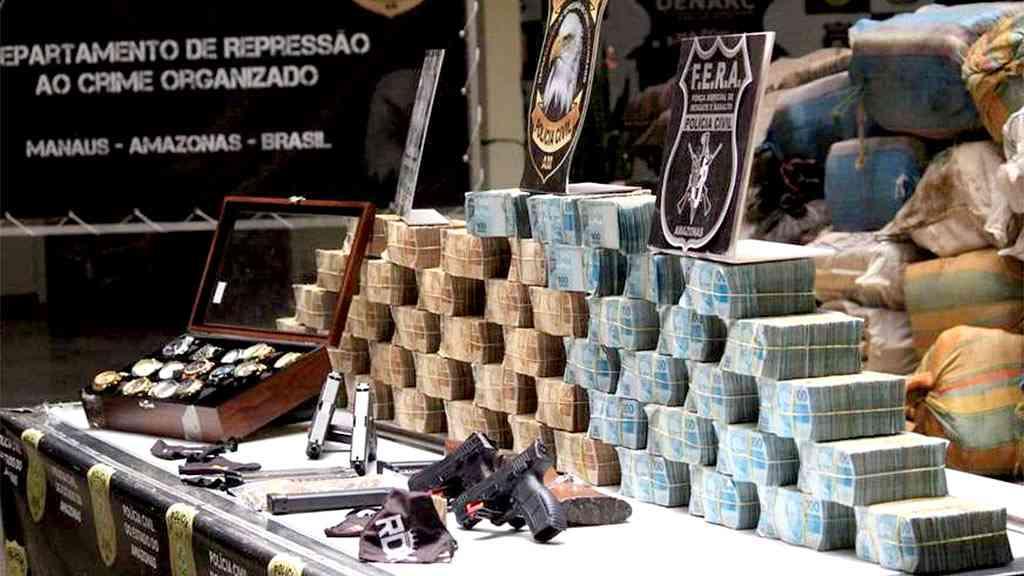 Cerca de R$ 3 milhões em dinheiro vivo, grande quantidade da maconha conhecida como 'skunk' e armamento apreendidos pela polícia do Amazonas