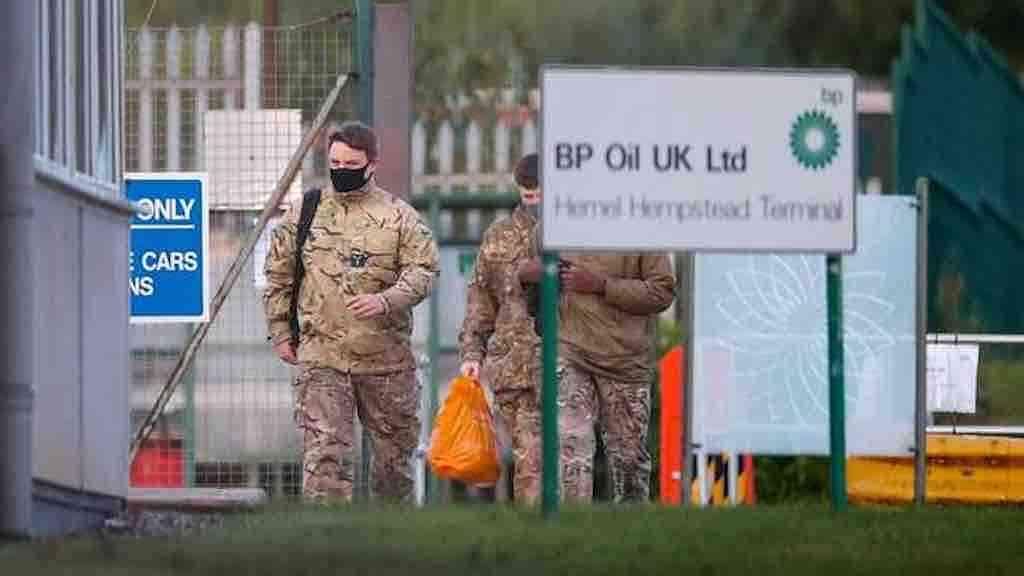 Militares britânicos em uniforme de combate chegaram a um depósito da BP nesta segunda-feira depois que o governo ordenou que o Exército ajude a distribuir combustíveis para enfrentar uma grande falta de caminhoneiros, disse um repórter da agência inglesa de notícias Reuters.