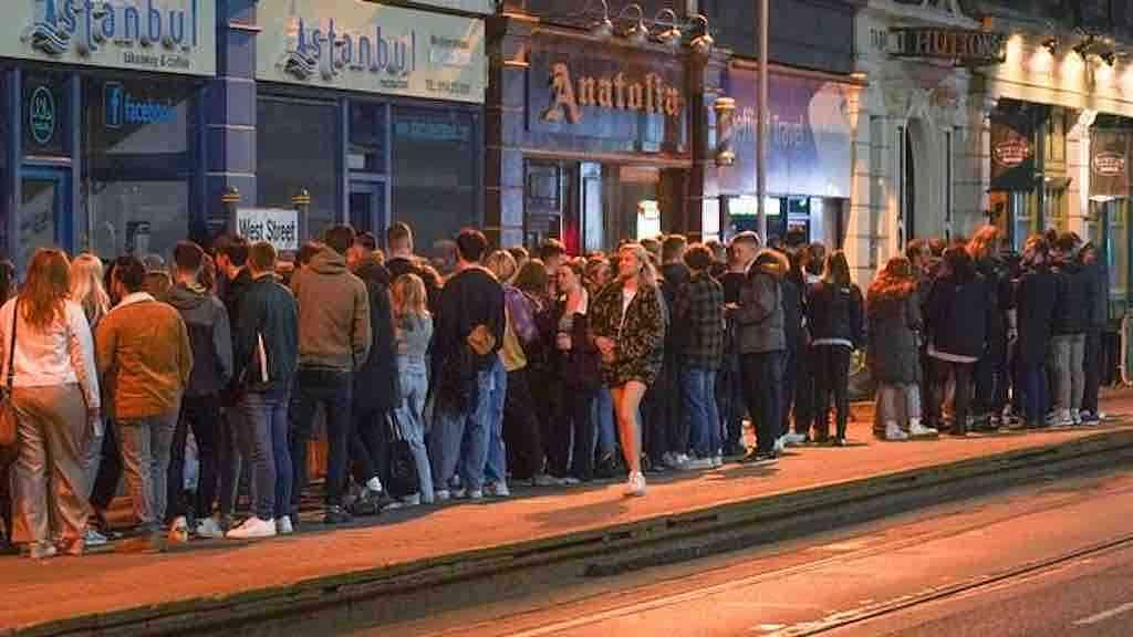 Jovens fazem fila para entrar em bar na cidade de Sheffield nas primeiras horas desta segunda