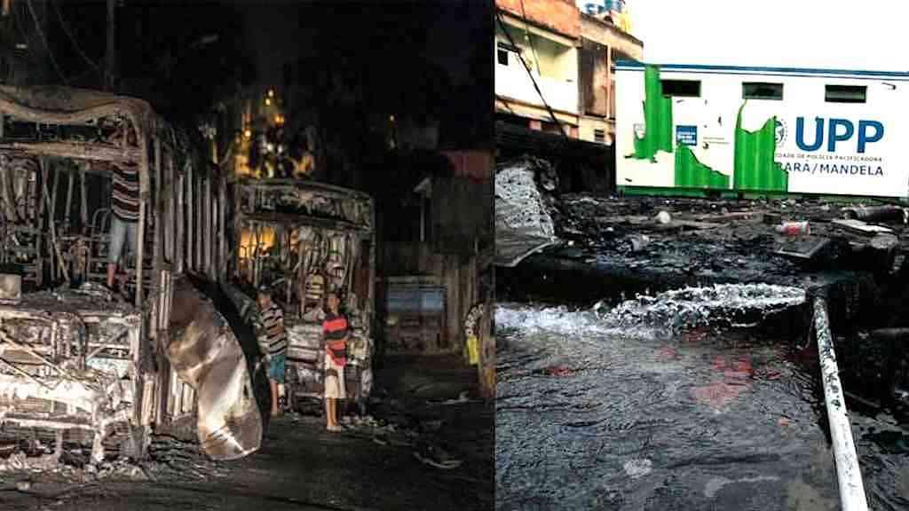 Segundo a Polícia Militar, duas equipes policiais foram atacadas em pontos diferentes da localidade e, durante os ataques, um ônibus foi incendiado na Rua Almirante Alexandrino, uma das principais do bairro de Santa Teresa. Posteriormente, outro coletivo foi incendiado no Rio Comprido, bairro vizinho.