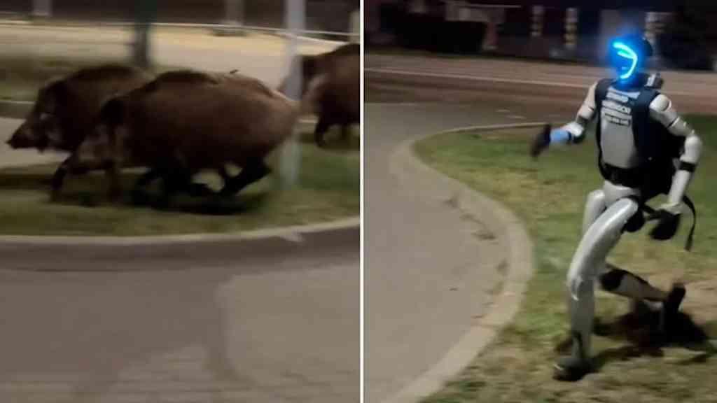 O robô é visto levando uma mochila, dando passos acelerados, avançando em direção aos javalis, que correm ainda mais rápido. Em alguns momentos, os animais se espalham pelas calçadas de uma área verde, mas voltam a se reagrupar com a aproximação do robô.