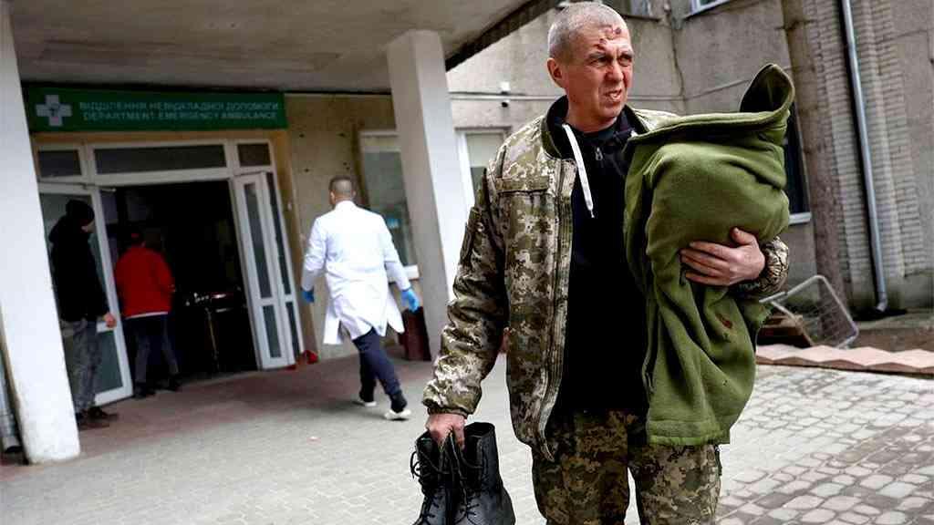 Militar ucraniano ferido no ataque a uma instalação do Exército recebe atendimento médico