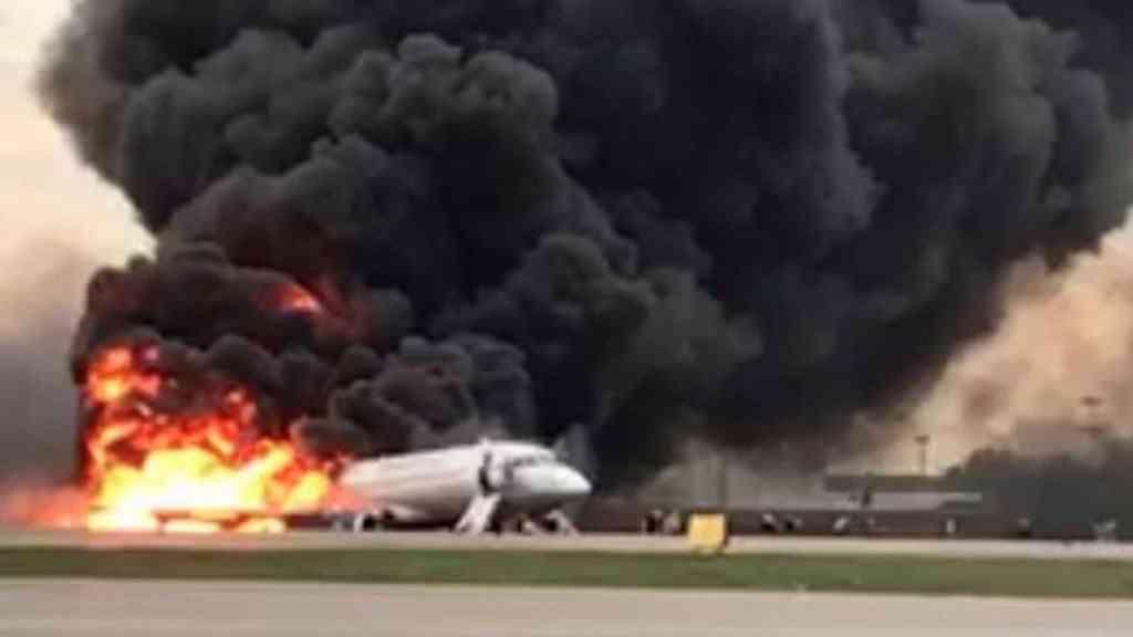 Imagens de televisão mostraram o avião pegando fogo na pista do aeroporto de Sheremtyevo, em Moscou, ao fazer um pouso de emergência no domingo.