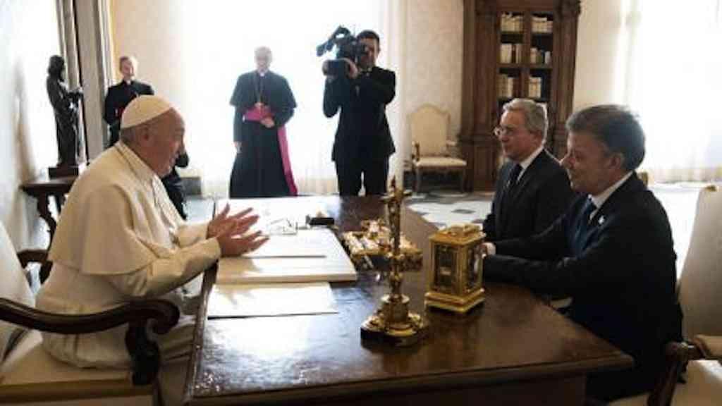Em sua terceira visita ao Vaticano, Santos apelou pelo apoio de Francisco para encerrar uma guerra de 52 anos que matou mais de 220 mil pessoas e deslocou milhões
