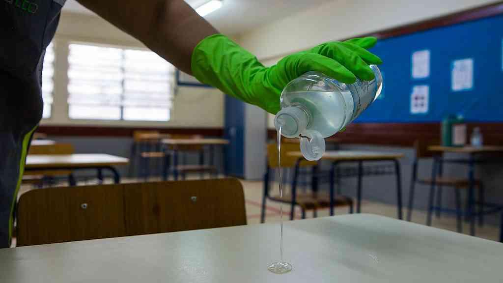 Higienização com álcool 70% ou hipoclorito de sódio 0,1% (água sanitária), dos pisos e paredes, das superfícies de toque e dos mobiliários e equipamentos das unidades escolares, diariamente.