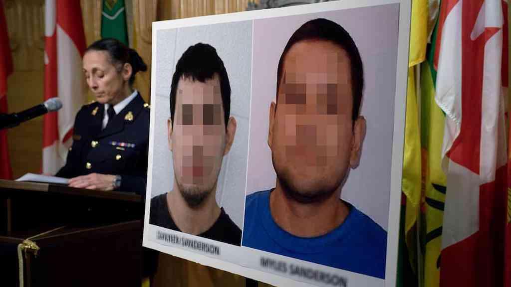 A Policia Montada Real do Canadá disse que Myles Sanderson, de 32 anos, estava na cidade de Rosthern, na mesma província onde ocorreram os crimes. Relatos na imprensa canadense sugerem que ele teria colidido um automóvel com uma viatura policial e acabou se rendendo.