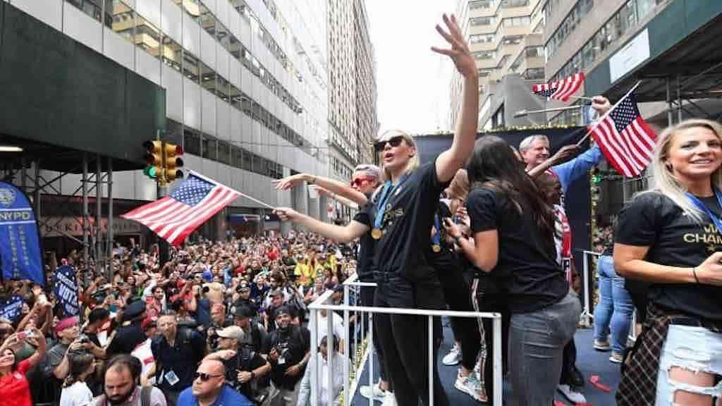 O desfile desta quarta-feira pela Broadway, no distrito financeiro da Nova York, também ressaltou a luta das jogadoras pela paridade salarial com seus colegas da seleção masculina, e por extensão o tema da paridade salarial para as mulheres em geral.