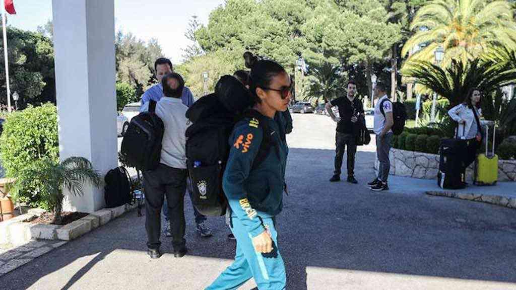Marta chega ao hotel, onde a seleção feminina ficará hospedada na cidade de Portimão, em Portugal, onde a seleção vai se preparar até a estreia na Copa do Mundo da França