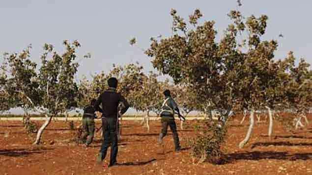Rebeldes carregando armas na cidade síria de Marea, ao norte de Aleppo