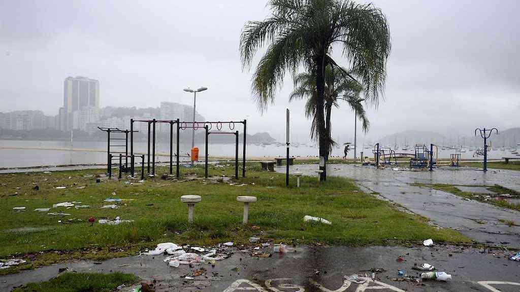 Temporal atinge o Rio de Janeiro causando vários estragos. Na praia de Botafogo, passagem de pedestre é alagada e lixo se espalha pelo calçadão