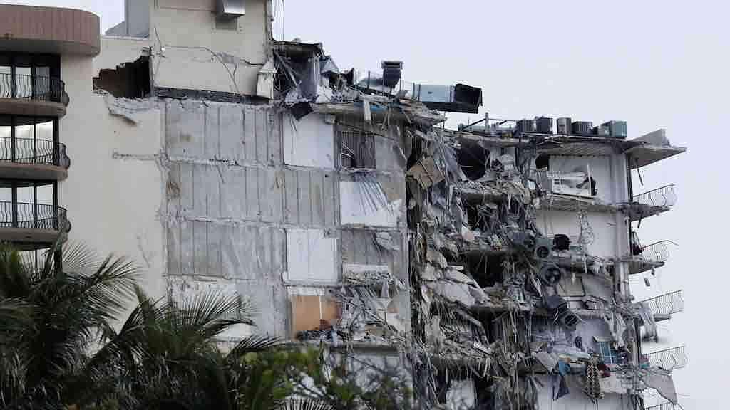 A causa do desmoronamento do Champlain Towers South, em Surfside, perto de Miami, continua sob investigação. Um relatório de engenharia de 2018 revelou deterioração grave do concreto da garagem subterrânea, além de um grande dano na placa de concreto abaixo da piscina. O autor, Frank Morabito, disse que a deterioração se "ampliaria exponencialmente" se não fosse consertada no futuro próximo.