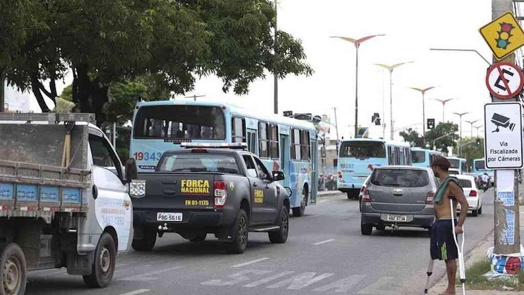 Militares da Força Nacional policiam as ruas, prédios e pontos de ônibus de Fortaleza visando garantir a ordem.