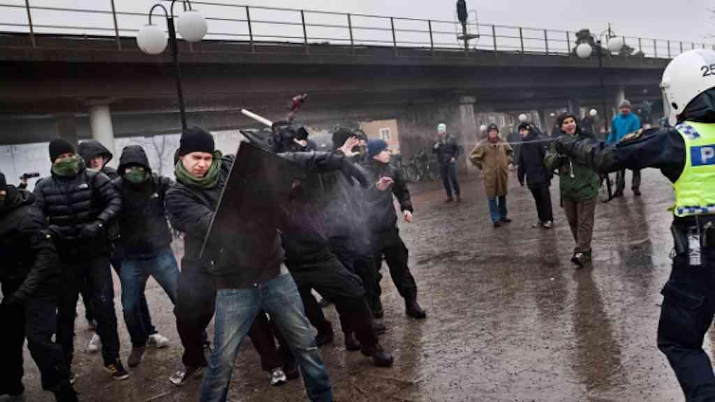 Embora Stram Kurs tenha recebido permissão para realizar sua manifestação no bairro de Skaggetorp, tradicional região de imigrantes, o violento confronto com as forças policiais foi descrito pela imprensa sueca como "inevitável".