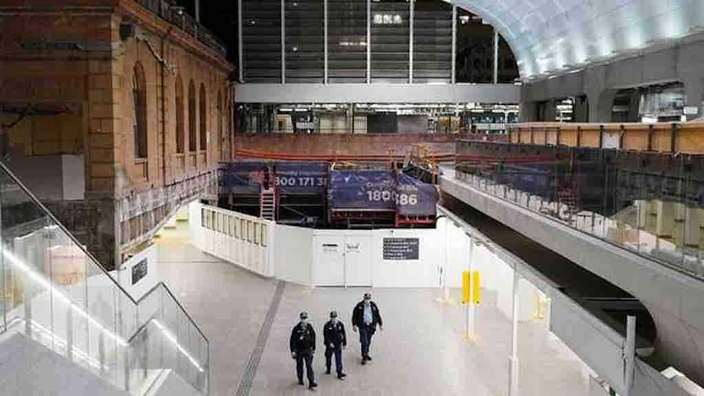 Policiais patrulham Estação Central de Sydney durante confinamento