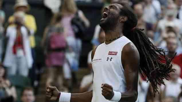 Tenista alemão Dustin Brown comemora vitória sobre tenista espanhol Rafael Nadal em Wimbledon