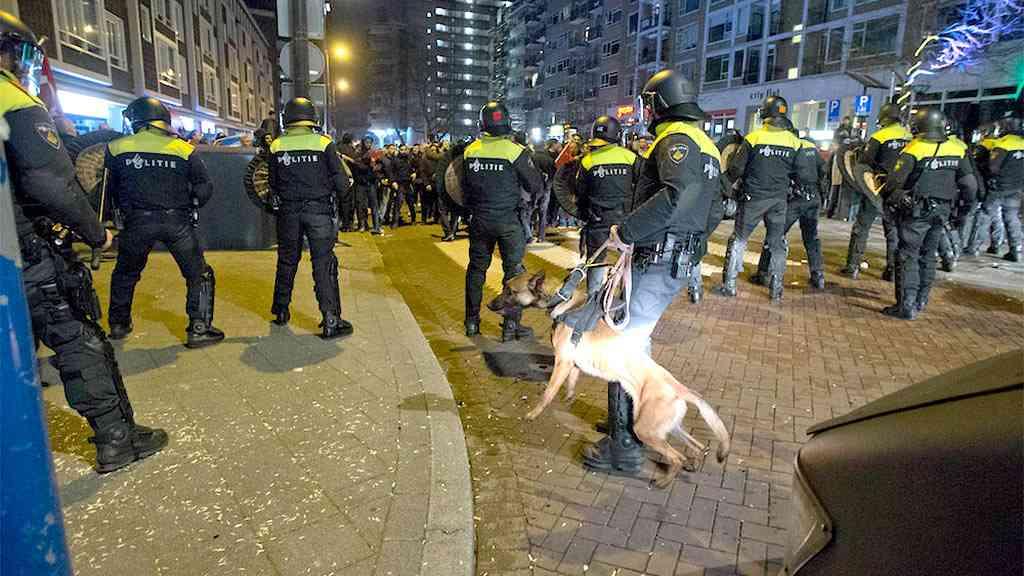 Centenas de manifestantes agitando bandeiras turcas se reuniram do lado de fora, exigindo ver a ministra. A polícia holandesa usou cães e canhões de água no início deste domingo para dispersar a multidão. Os manifestantes devolveram a iniciativa com garrafas e pedras. Vários manifestantes foram espancados pela polícia com bastões, disse uma testemunha à agência inglesa de notícias Reuters. Eles carregavam cargas a cavalo, enquanto os oficiais avançavam a pé com escudos e furgões blindados.