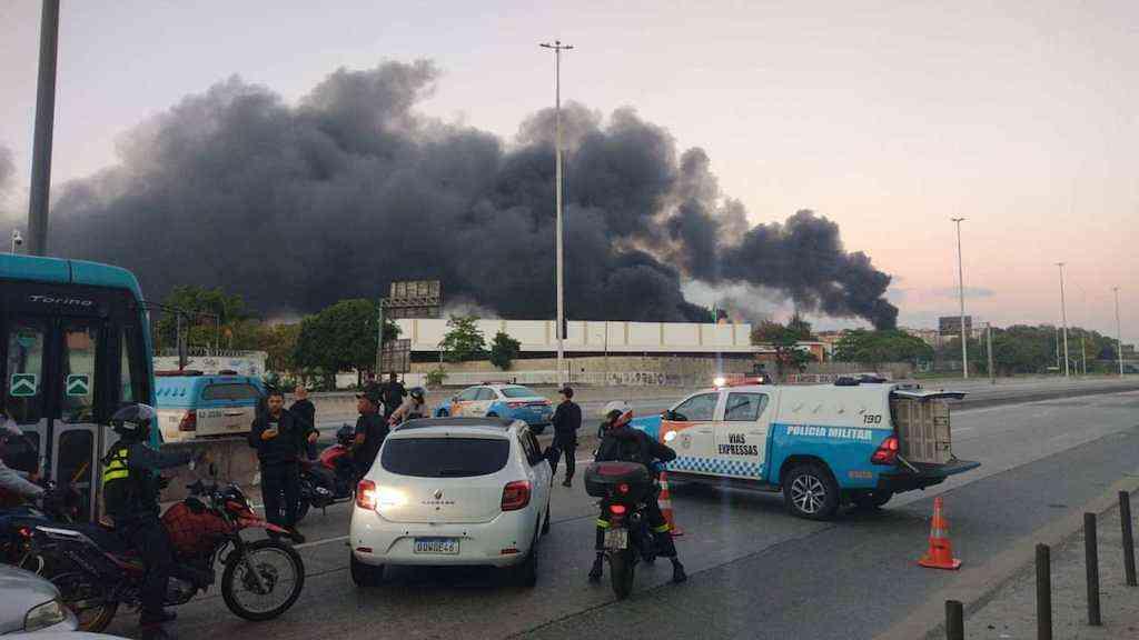 Imagens mostram barricadas formadas por pneus pegando fogo. Interdição impacta na circulação de trens no ramal Saracuruna e do BRT. PM reforça o policiamento na área.