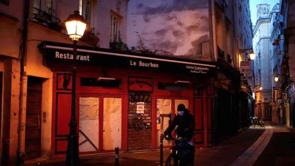 Homem passa em frente a restaurante fechado em Paris devido à pandemia