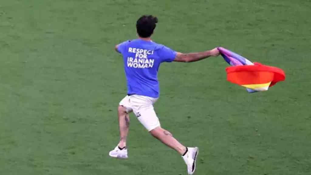 O italiano Mario Ferri, torcedor que invadiu o campo do estádio Lusail com uma bandeira com as cores da comunidade LGBTQIA+, foi liberado pela polícia do Catar.