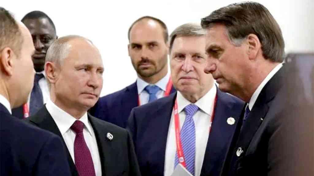O presidente russo, Vladimir Putin, fita diretamente o contraparte brasileiro, Jair Bolsonaro, que desvia o olhar. A imagem viralizou nas redes sociais