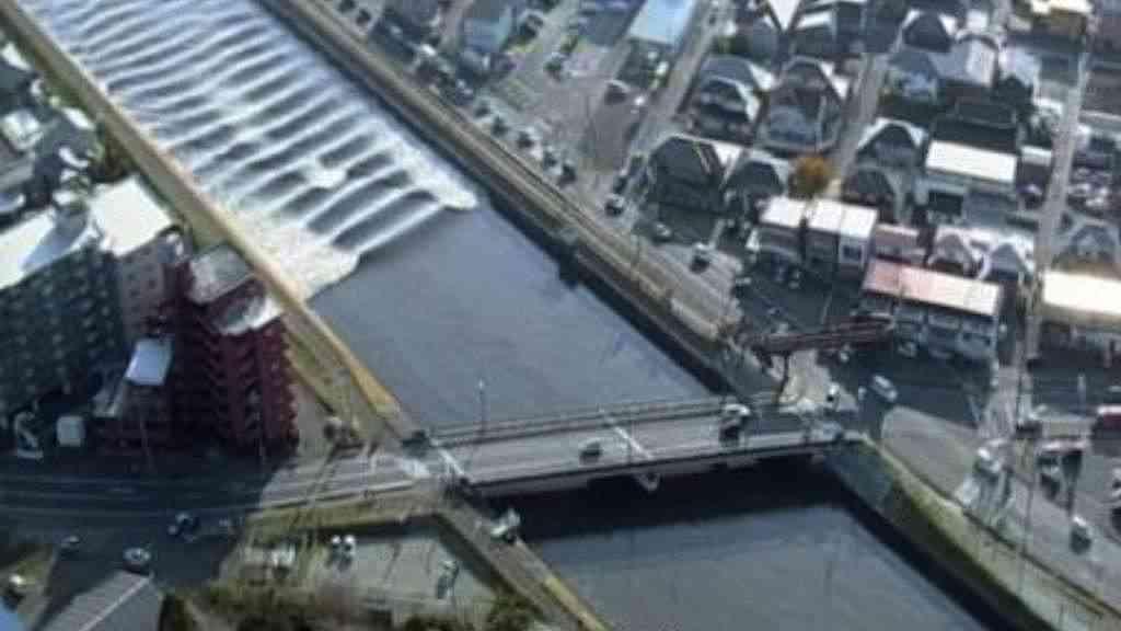 Imagens aéreas mostraram ondas do tsunami enchendo rios em algumas áreas. Alguns barcos de pesca virados no porto de Higashi-Matsushima. Antes de a JMA suspender seus alertas.